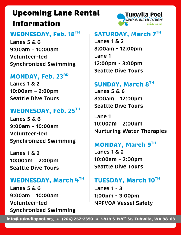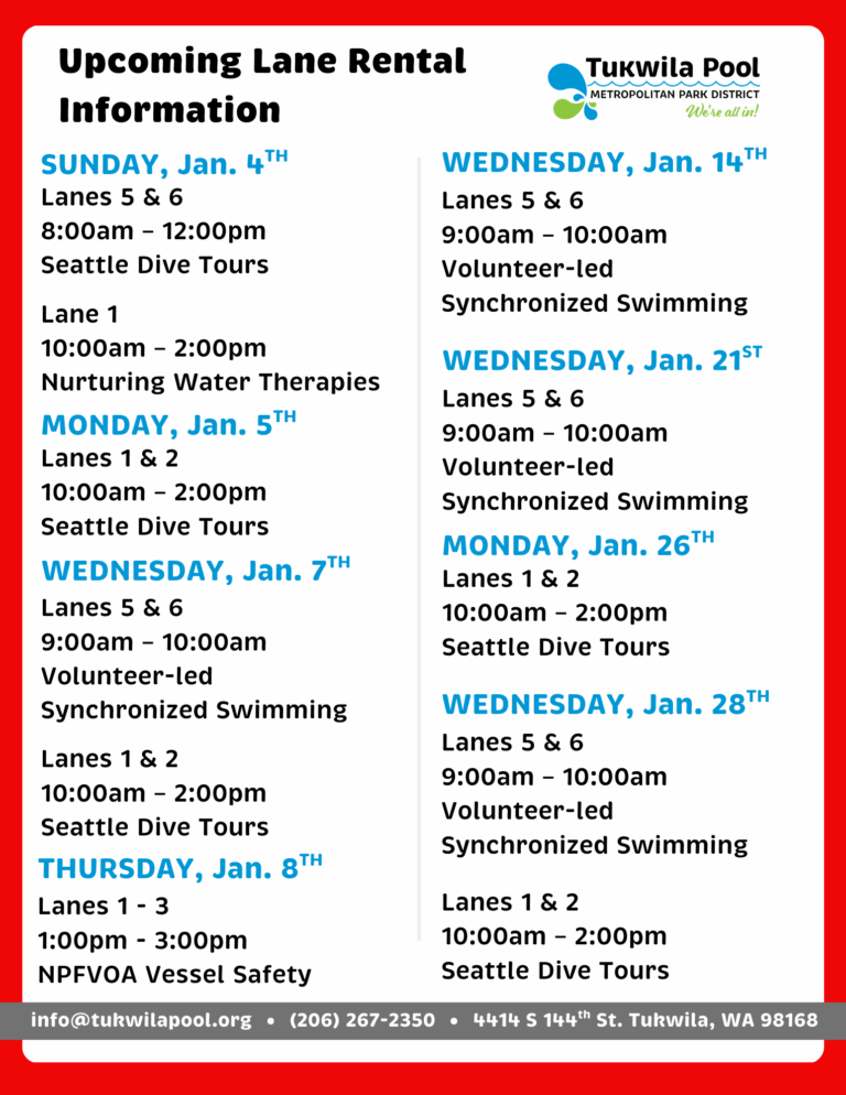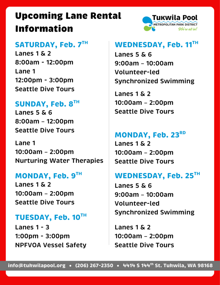 Lane Rentals, Usage, & Updates Last Updated: 11/11/2025 @ 2:45pm For the Fall/Winter 2025 Pool Schedule Click here Contact Us STREET ADDRESS:4414 S. 144th St.Tukwila, WA 98168(located between Foster High School and Showalter Middle School)PHONE: (206) 267-2350EMAIL: info@tukwilapool.org